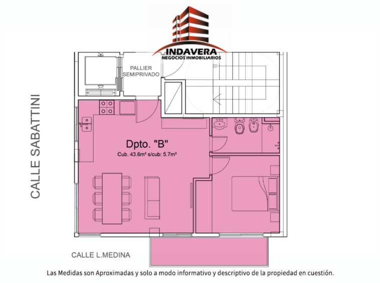 Palier semiprivado, amplio living comedor con cocina integrada y espacio para lavarropas, amplio dormitorio con placard empotrado. Baño completo con vanitory y ducha. Muy Luminosos. Optima distribución.